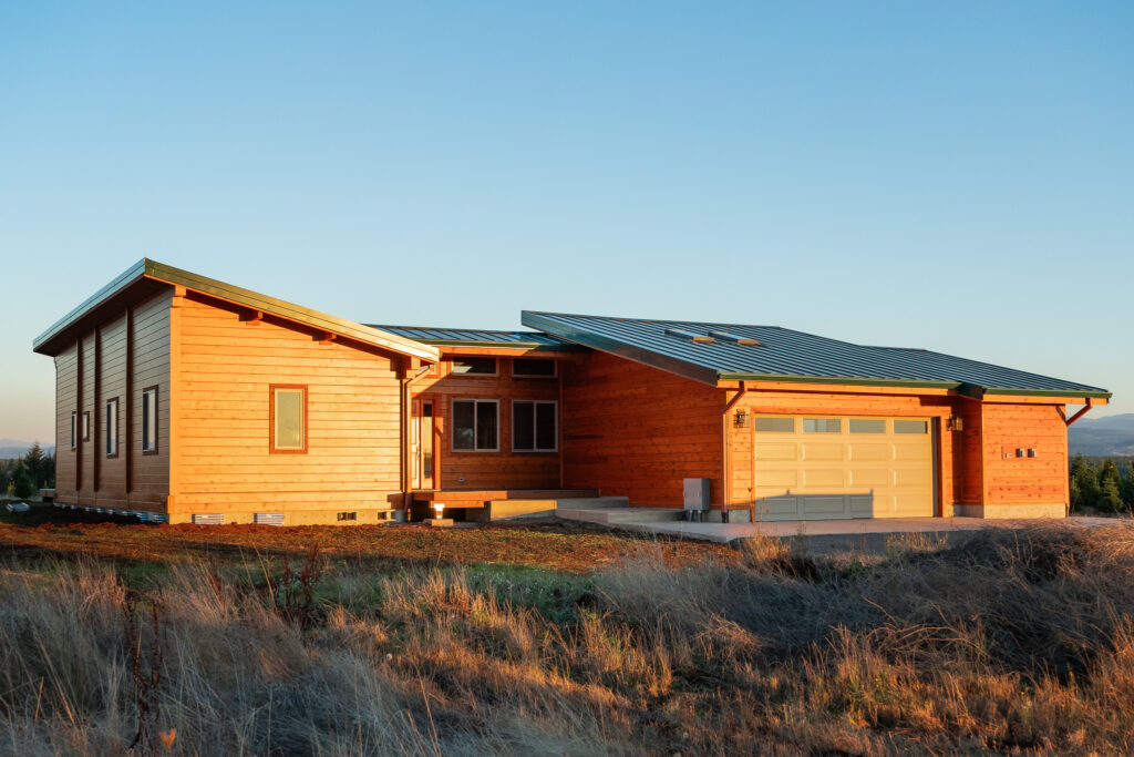 The customer chose a Forest Green standing seam metal roof that went so well with the cedar exterior home color giving it a warm, rustic and cozy appearance. The interior showcased the exposed large glue lamb beams supporting the roof. The brackets were left exposed for a unique and trendy look. Large windows and multiple sliding glass doors were strategically placed on every wall to bring in natural light and the expansive views of the landscape and mountains.