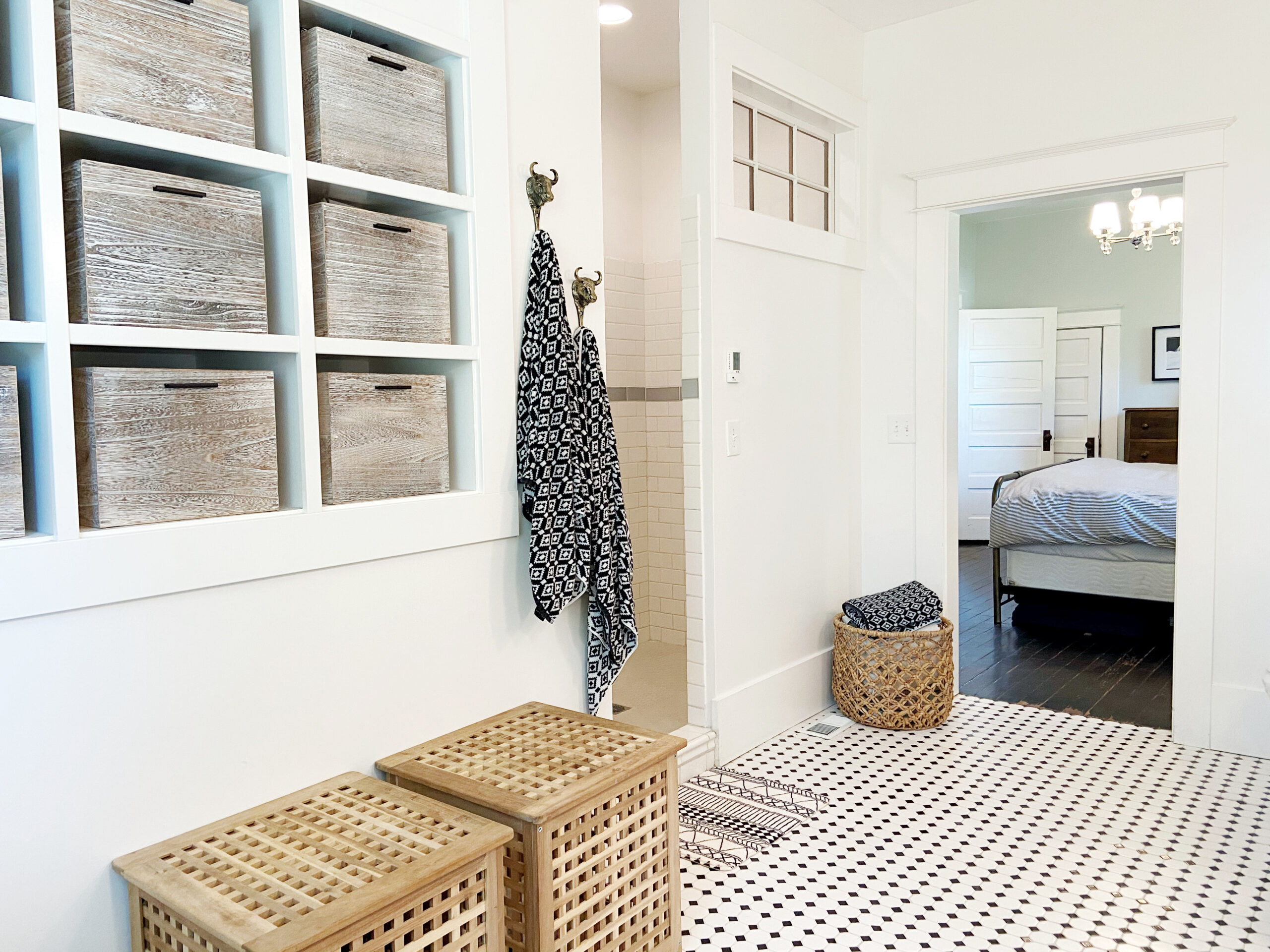 The hardwood floors were original to the house and were refurbished and reinstalled CVG tongue and groove fir. The bathroom and bonus rooms upstairs included custom built in shelving. One of the most creative ideas the homeowners had was the stair railing. We crafted wood frames and inserted black coated wire mesh inside the frame. The same idea was used in the pantry door. A beautifully tailored sliding barn door was added in the master bedroom leading to the completely restored master bathroom.