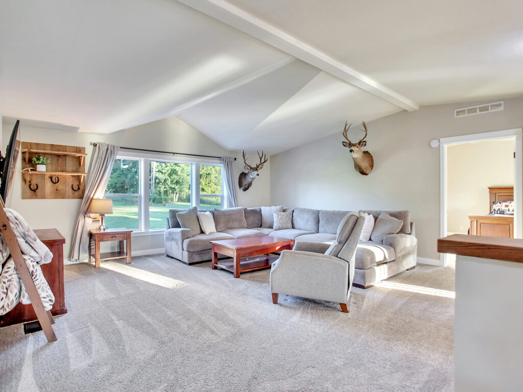 The customer chose a Forest Green standing seam metal roof that went so well with the cedar exterior home color giving it a warm, rustic and cozy appearance. The interior showcased the exposed large glue lamb beams supporting the roof. The brackets were left exposed for a unique and trendy look. Large windows and multiple sliding glass doors were strategically placed on every wall to bring in natural light and the expansive views of the landscape and mountains.